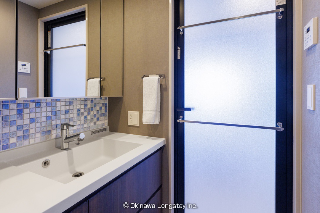 木目の収納とブルーグレーのタイルを合わせた、落ち着きある佇まい。