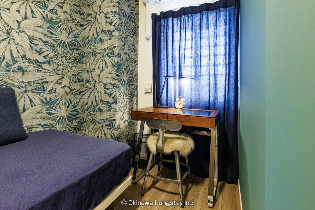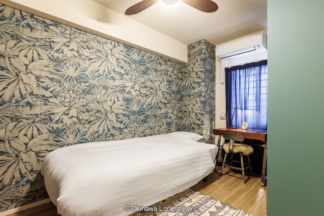 リーフ柄のファブリックやカーテンが統一感を生み、