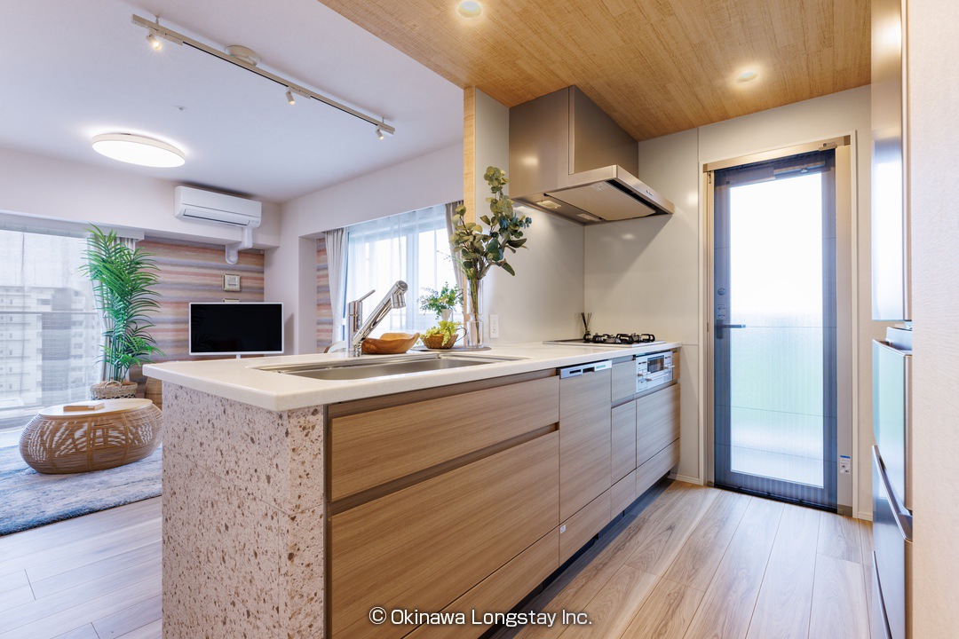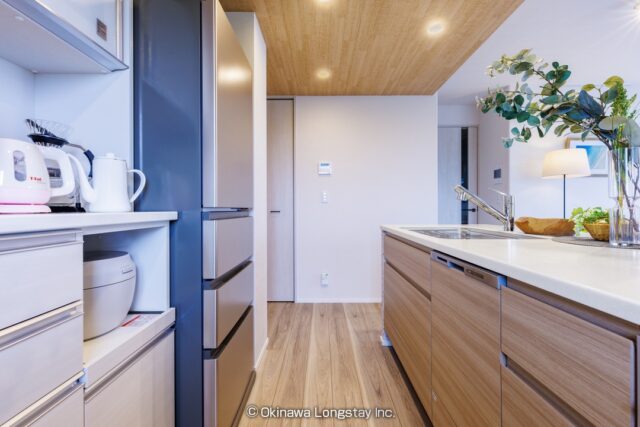 キッチンスペースのみ天井が木目仕上げとなっており、