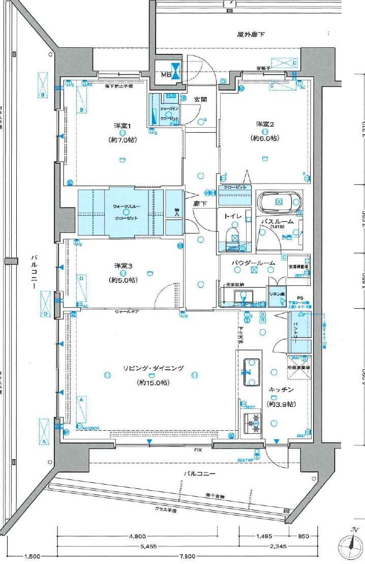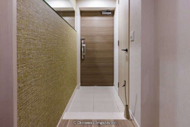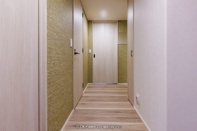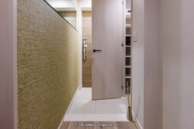足元の明るいタイルと、廊下へ続く木目の床との切り替えも美しく、