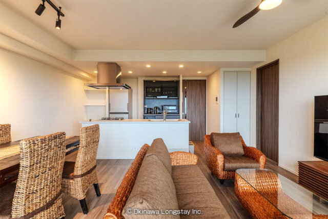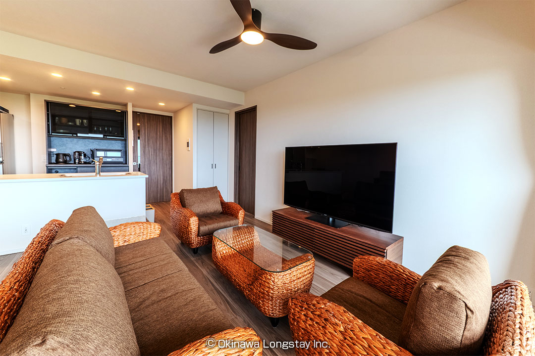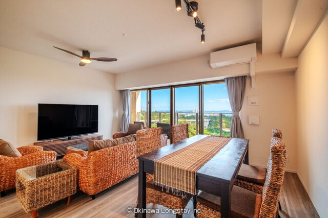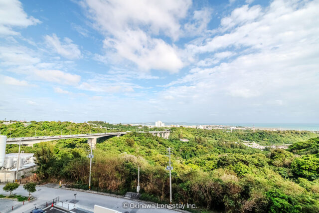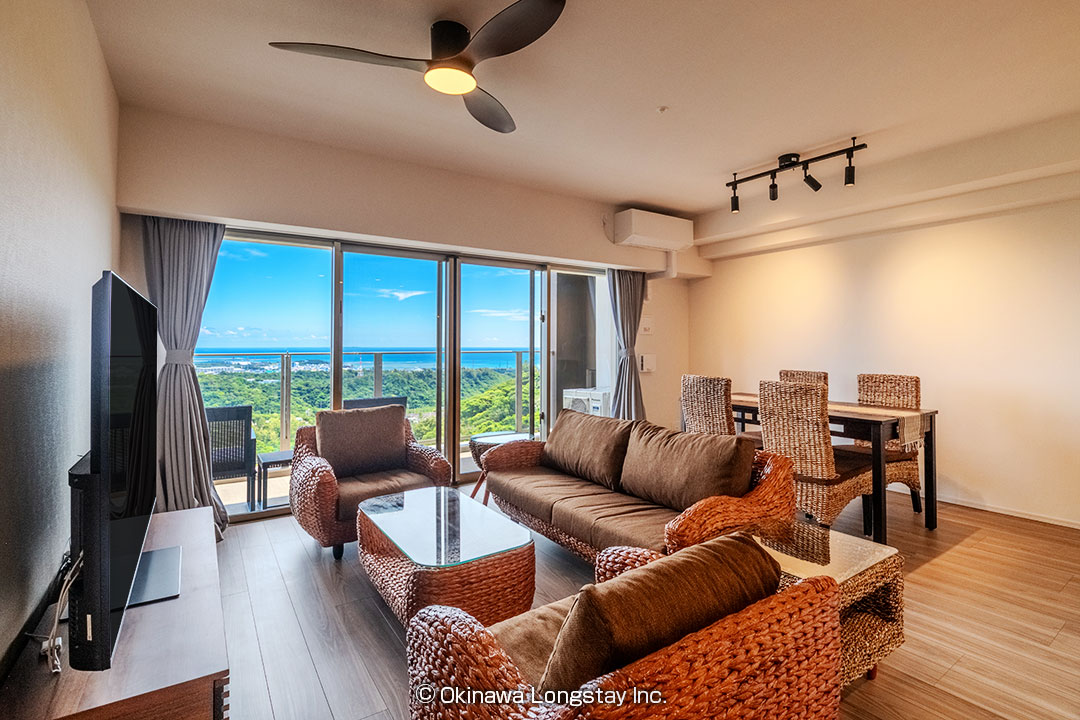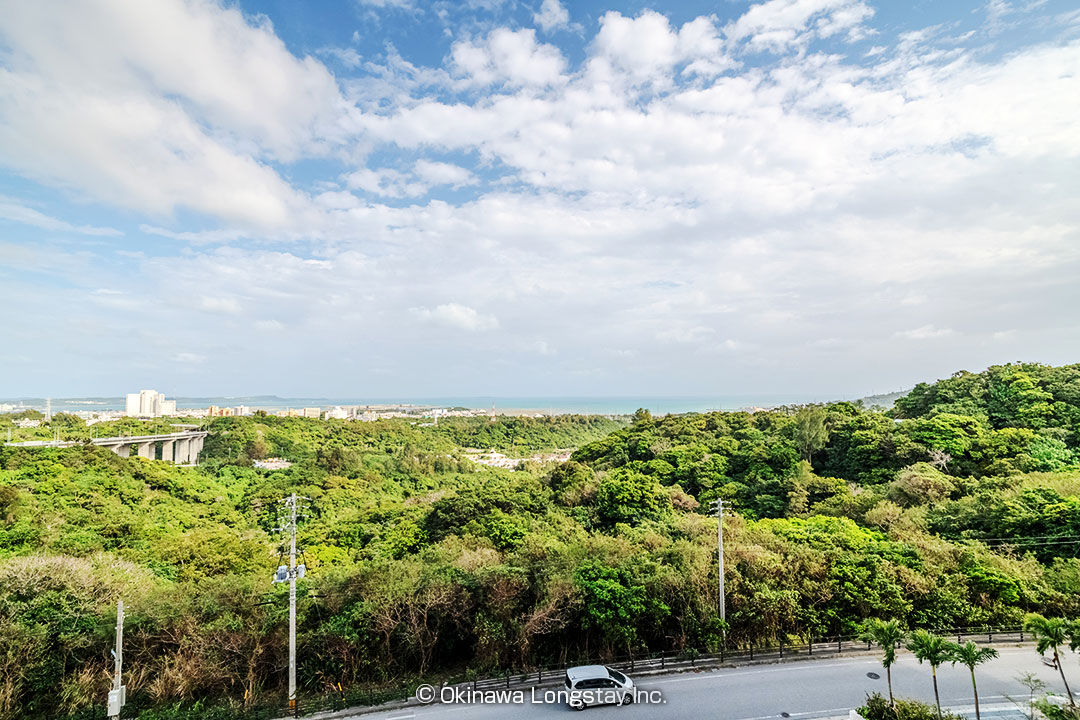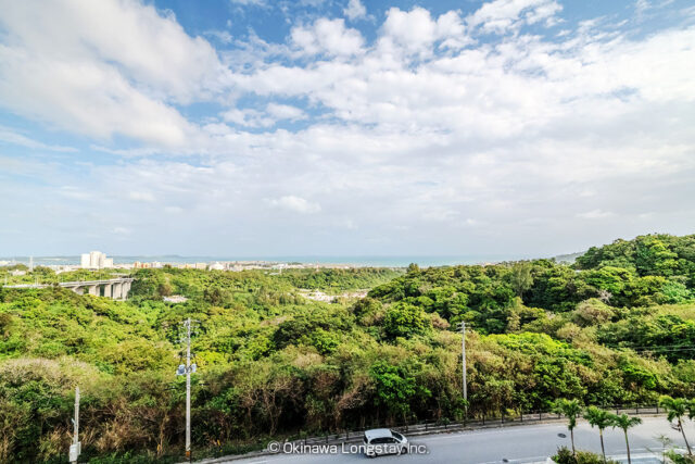 大きく開かれたバルコニーからは、沖縄の豊かな緑と街並み、そしてその先に広がる海までを一望。