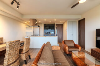大きな窓から差し込む光と、その先に広がる景色。室内にいながらも、外の開放感を感じられるリビングです。アジアンテイストの家具で統一されたインテリアは、自然素材ならではの温もりと落ち着きを感じさせ、空間全体にやさしい一体感を生み出します。ブラウンでまとめられたシーリングファンや照明が、空間にほどよいアクセントを加え、昼と夜で異なる表情を演出。