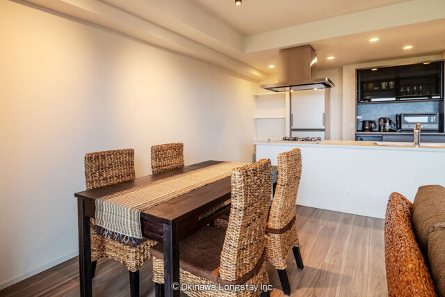 リビングとひと続きになったダイニングスペースは、開放感のある空間の中で、ゆったりと食事を楽しめる設計。アジアンテイストのダイニングセットが空間に自然に溶け込み、落ち着きのある上質な雰囲気を演出します。大きな窓の先に広がる景色を眺めながら、朝の食事から夜のひとときまで、心地よい時間を過ごせるのも魅力。
