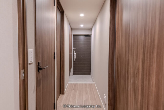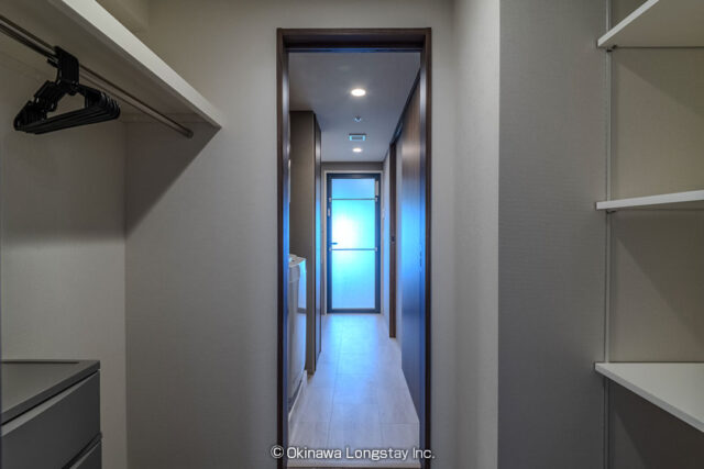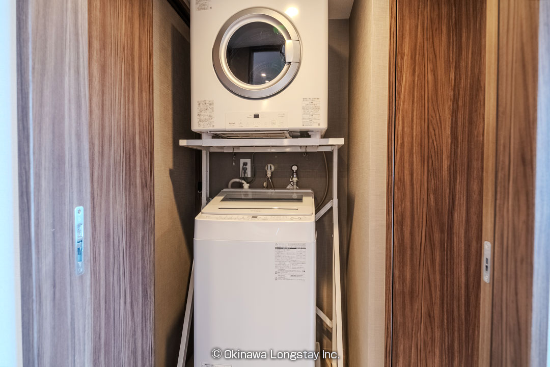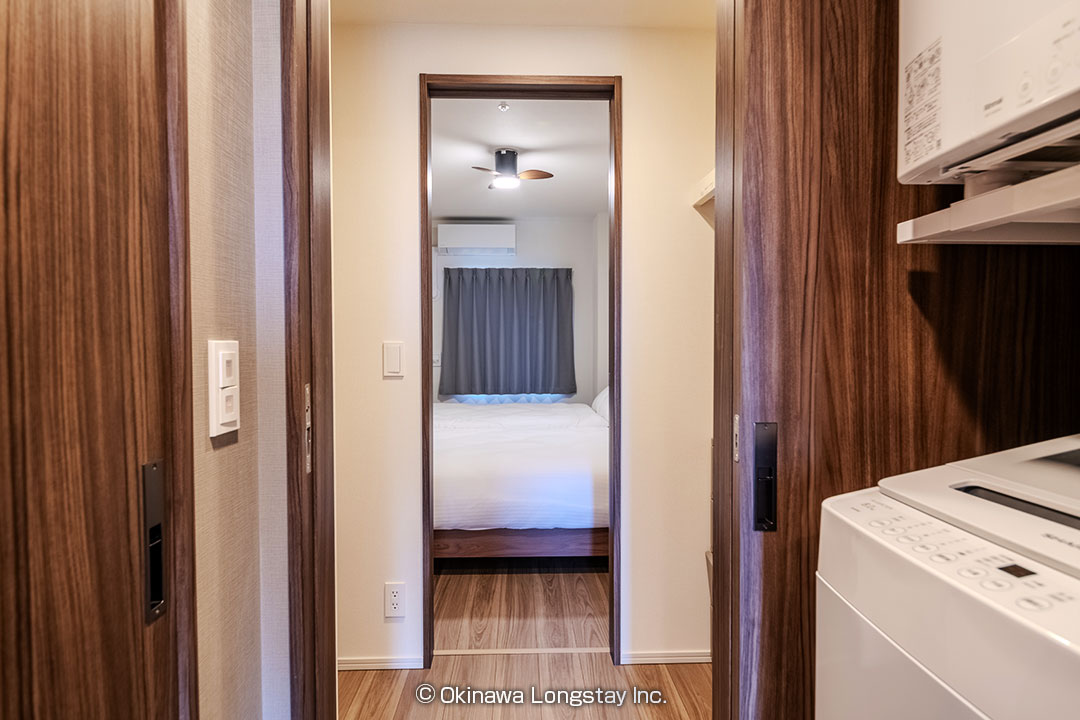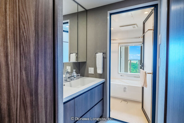 ランドリーから洗面台、バスルームへとつながる動線もスムーズで、滞在中の生活をストレスなく過ごせる設計です。