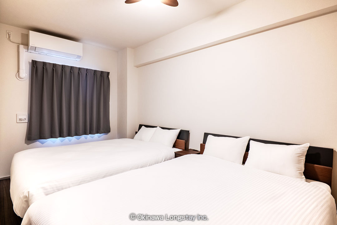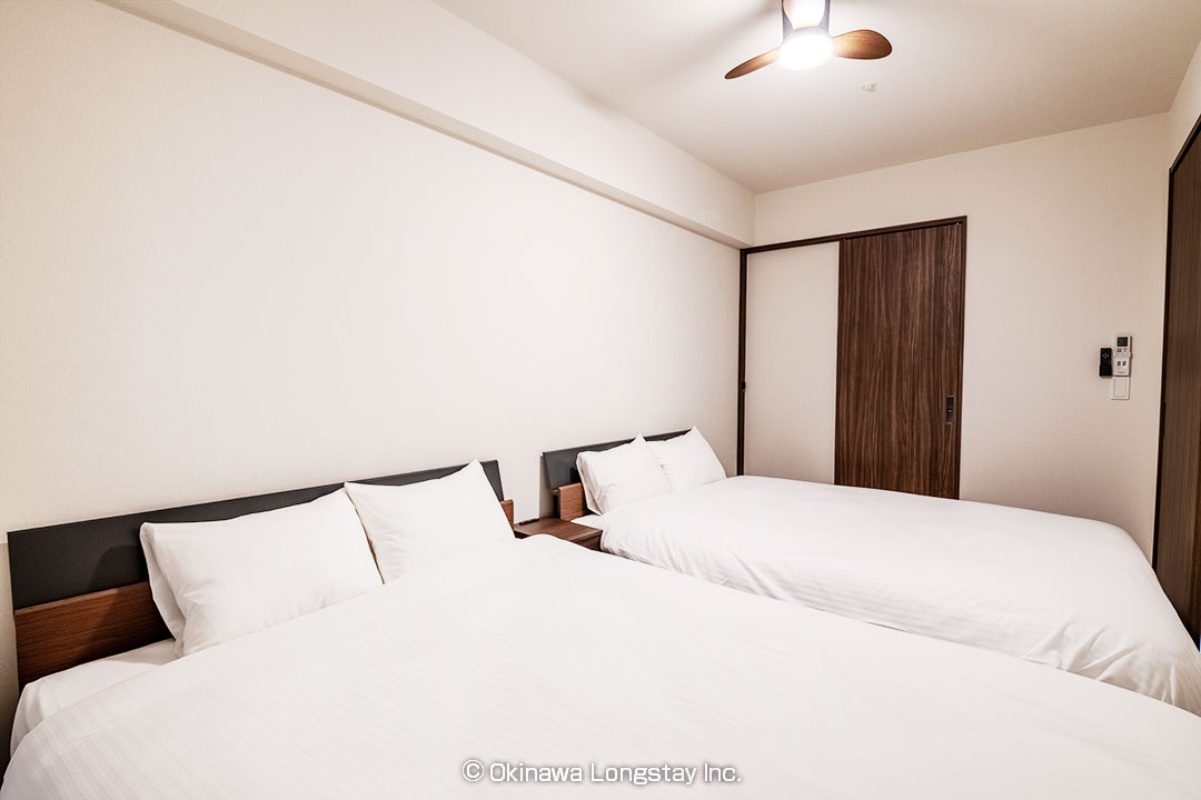 メインのベッドルームにはダブルベッドを2台配置し、ご家族やグループでも、ゆったりとお休みいただけます。こちらのベッドルームからはウォークスルークローゼットを抜け、ランドリーから洗面台、バスルームへとつながるスムーズな動線。生活の流れが自然に整う設計で、朝の身支度から就寝までを快適にサポートします。