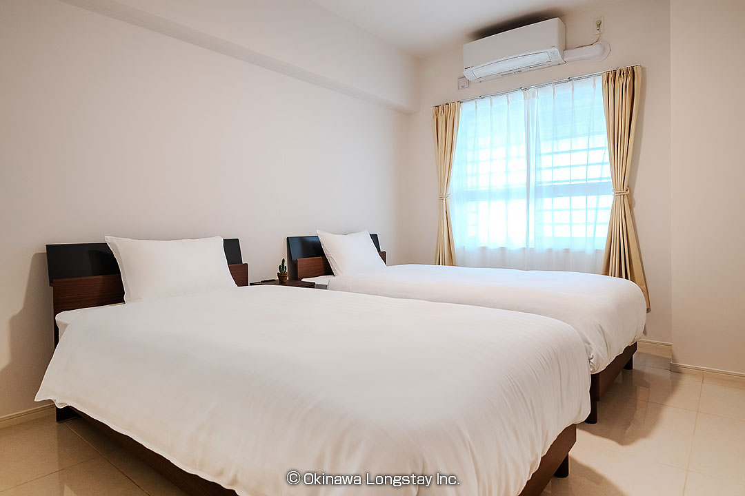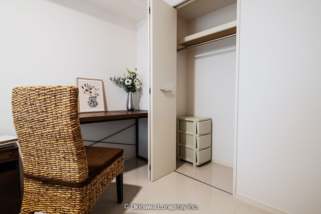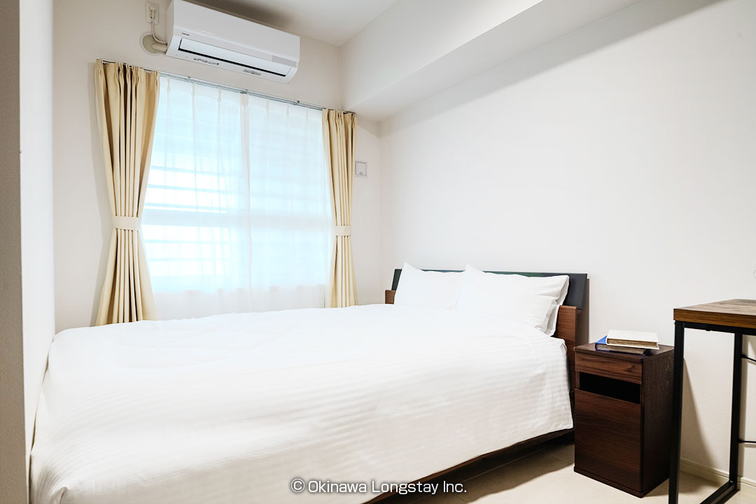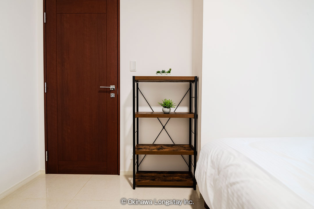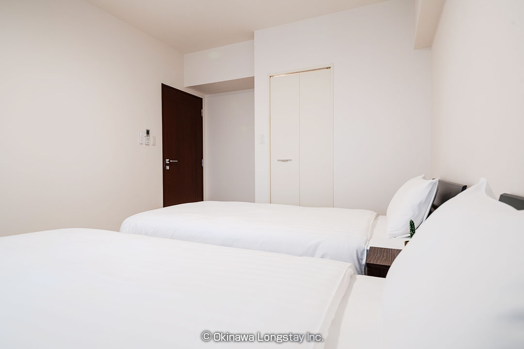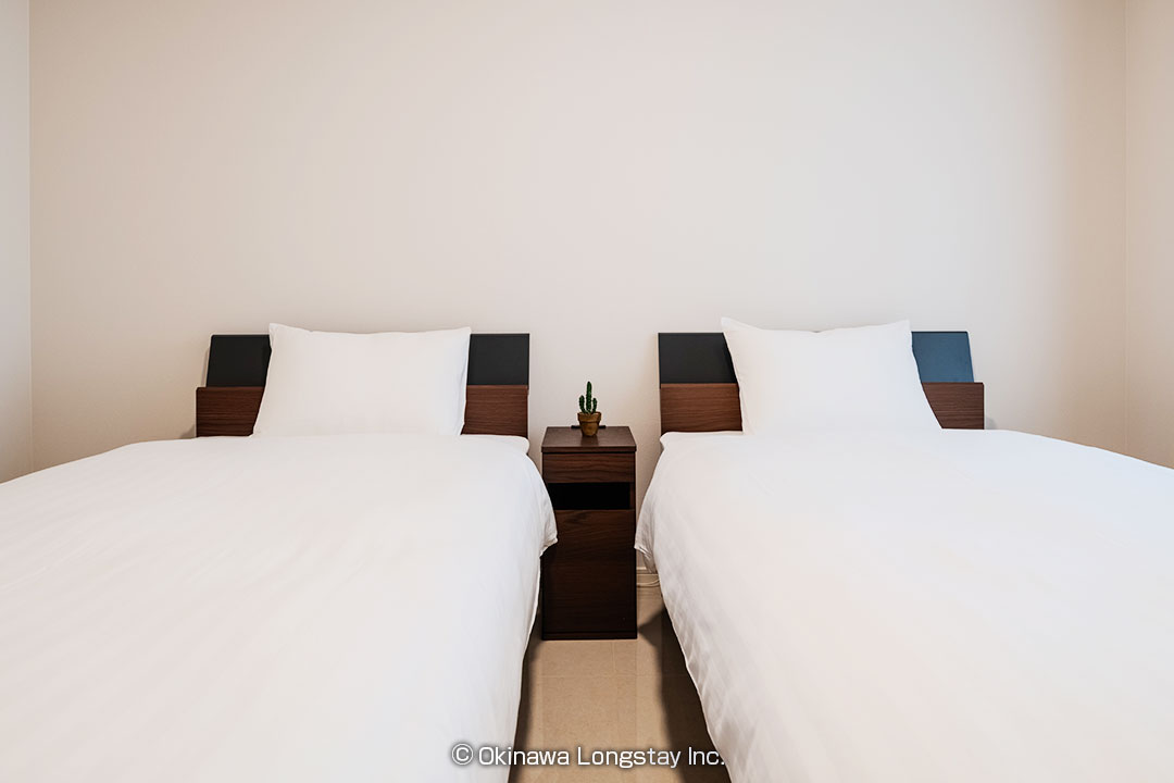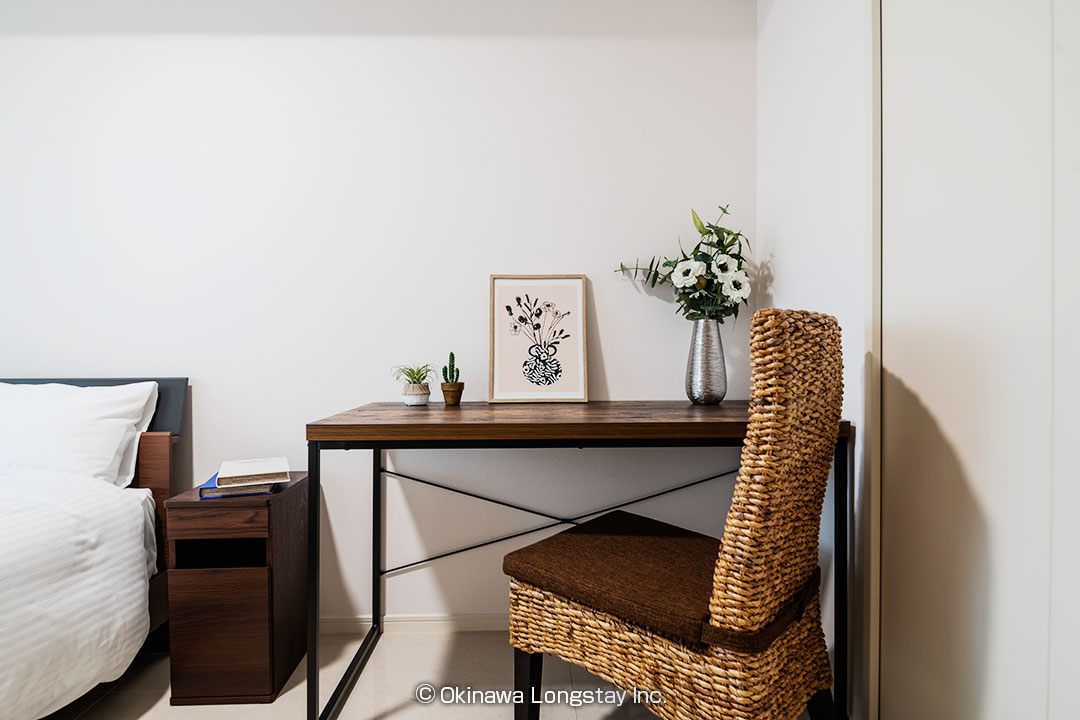 白を基調としたシンプルな空間に、落ち着いたトーンの家具がやさしくなじむベッドルーム。2つの寝室があり、それぞれが静かな時間を過ごせるつくりに。ひとつの部屋にはデスクも備えられており、軽く作業をしたり、自分の時間に集中したりと、滞在中の過ごし方にもゆとりが生まれます。一日の終わりを、静かに心地よく迎えられる場所です。